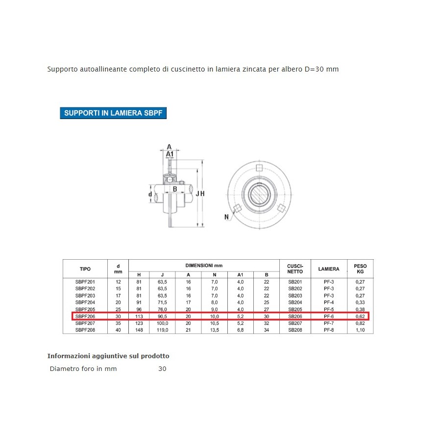 Supporto autoallineante completo di cuscinetto in lamiera zincata per albero D=30 mm
