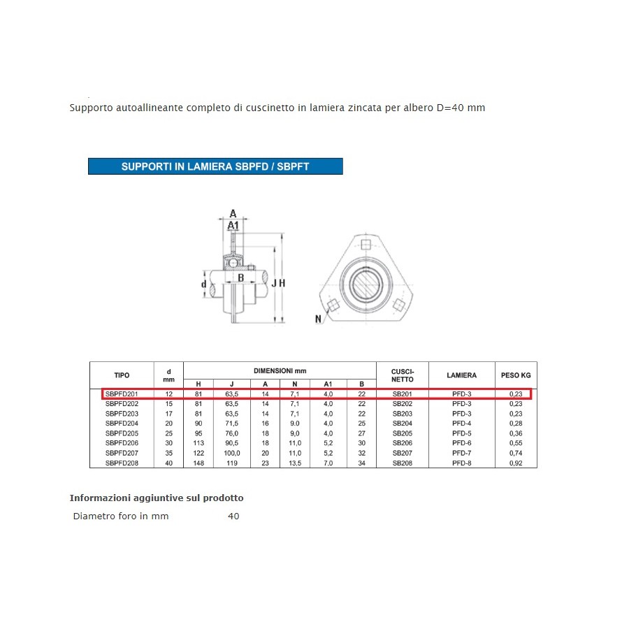 Supporto autoallineante completo di cuscinetto in lamiera zincata per albero D=40 mm