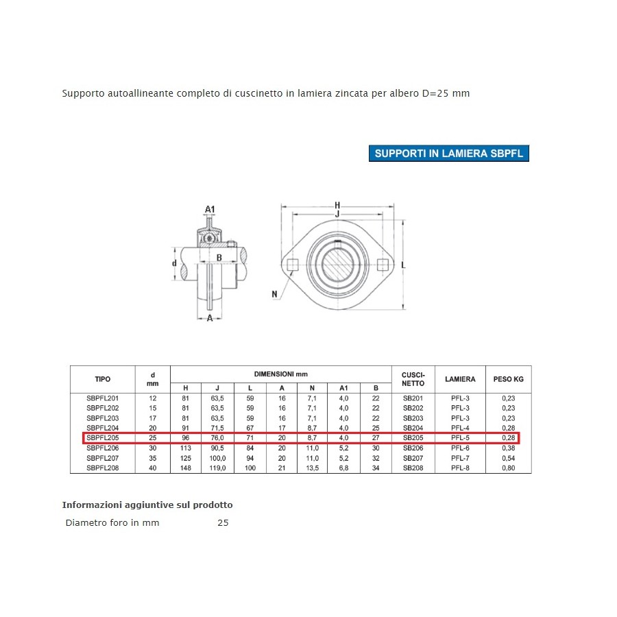 Supporto autoallineante completo di cuscinetto in lamiera zincata per albero D=25 mm