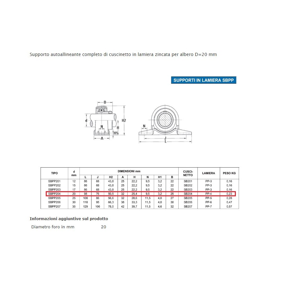 Supporto autoallineante completo di cuscinetto in lamiera zincata per albero D=20 mm