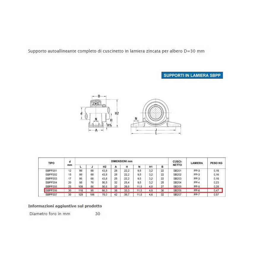Supporto autoallineante completo di cuscinetto in lamiera zincata per albero D=30 mm