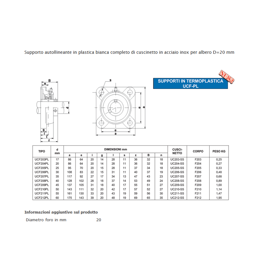 Supporto autollineante in plastica bianca completo di cuscinetto in acciaio inox per albero D=20 mm