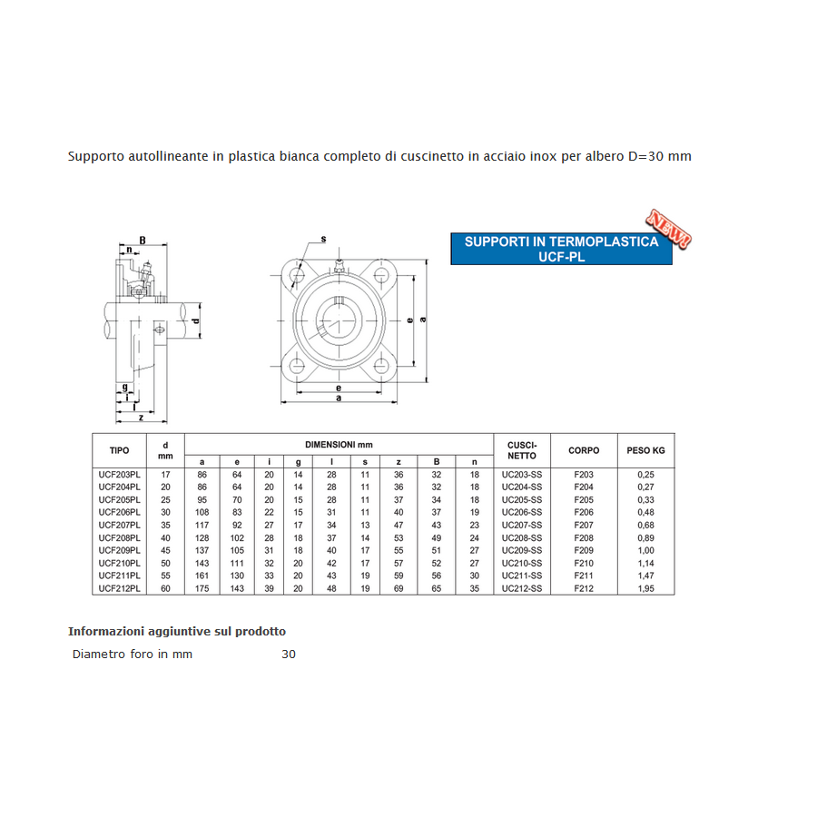 Supporto autollineante in plastica bianca completo di cuscinetto in acciaio inox per albero D=30 mm
