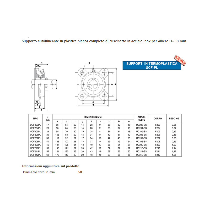 Supporto autollineante in plastica bianca completo di cuscinetto in acciaio inox per albero D=50 mm