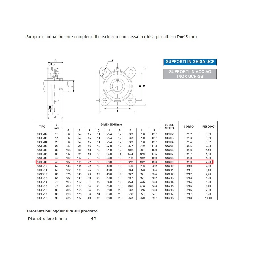 Supporto autoallineante completo di cuscinetto con cassa in ghisa per albero D=45 mm