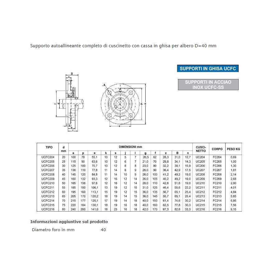 Supporto autoallineante completo di cuscinetto con cassa in ghisa per albero D=40 mm