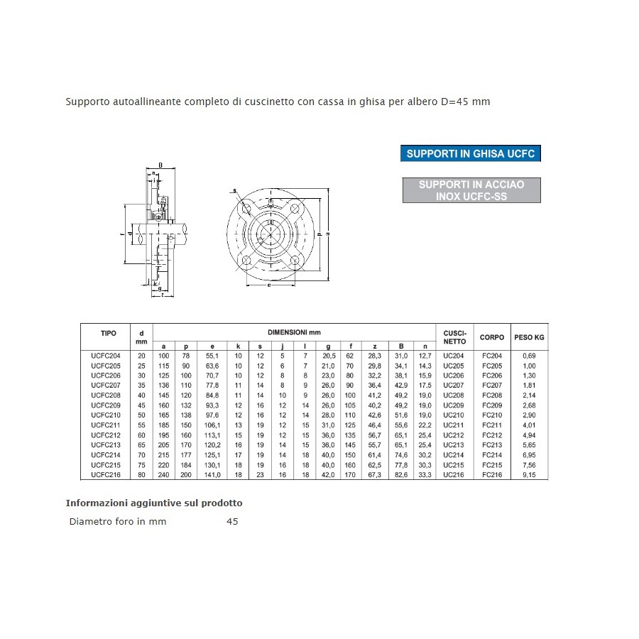Supporto autoallineante completo di cuscinetto con cassa in ghisa per albero D=45 mm