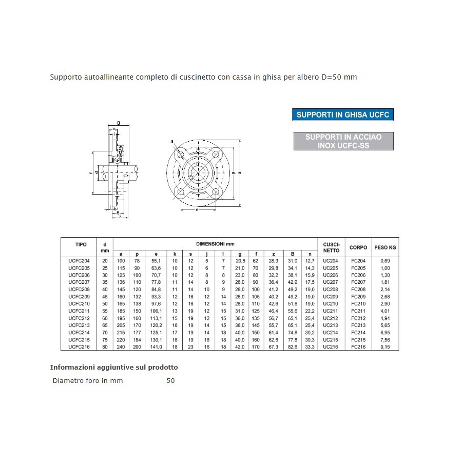Supporto autoallineante completo di cuscinetto con cassa in ghisa per albero D=50 mm