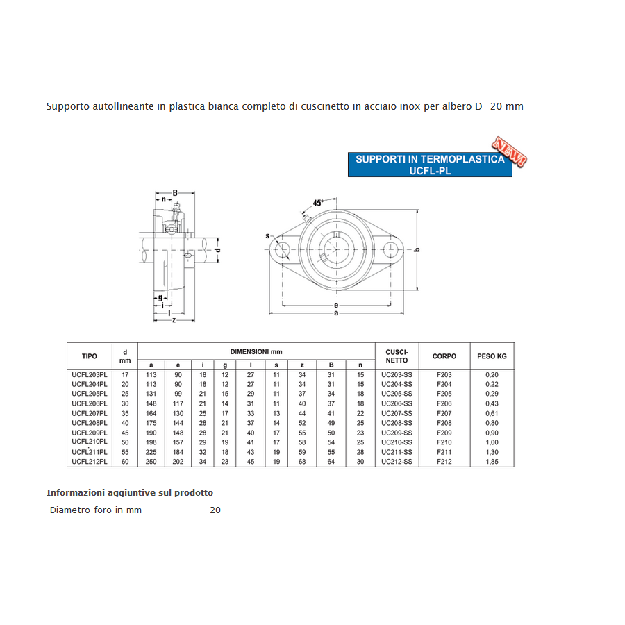Supporto autollineante in plastica bianca completo di cuscinetto in acciaio inox per albero D=20 mm
