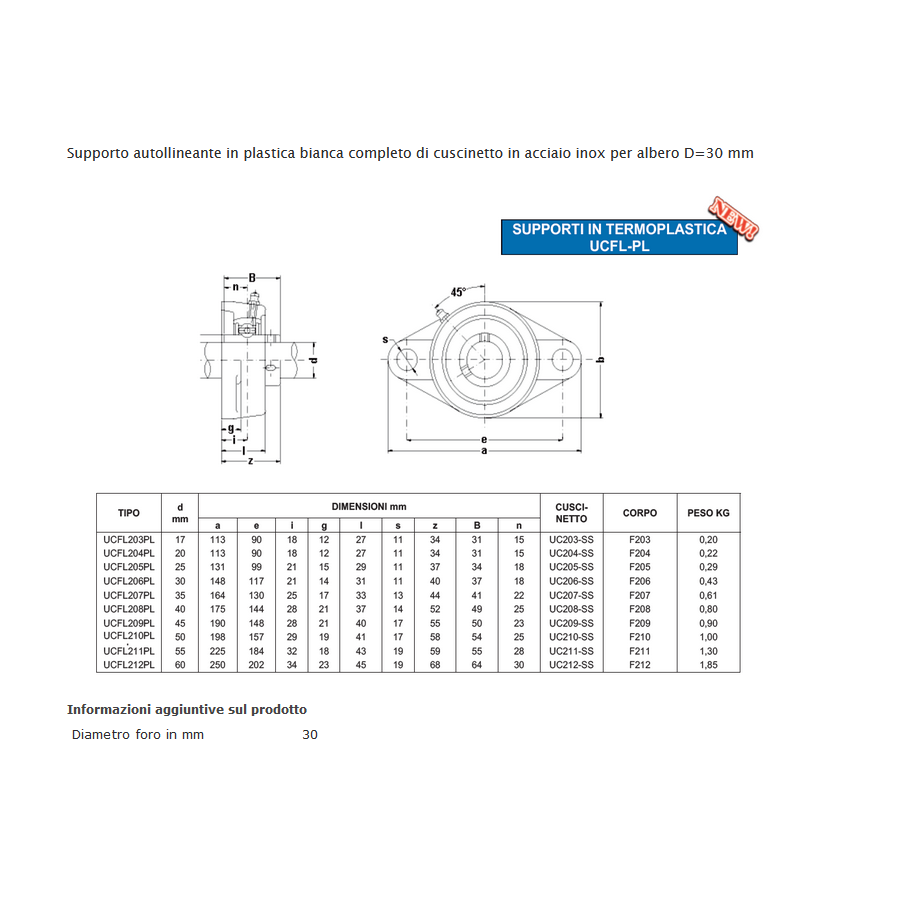 Supporto autollineante in plastica bianca completo di cuscinetto in acciaio inox per albero D=30 mm
