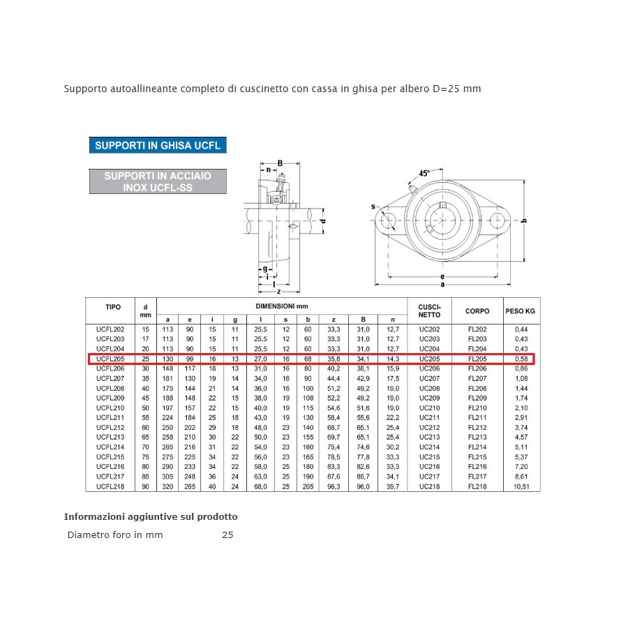 Supporto autoallineante completo di cuscinetto con cassa in ghisa per albero D=25 mm