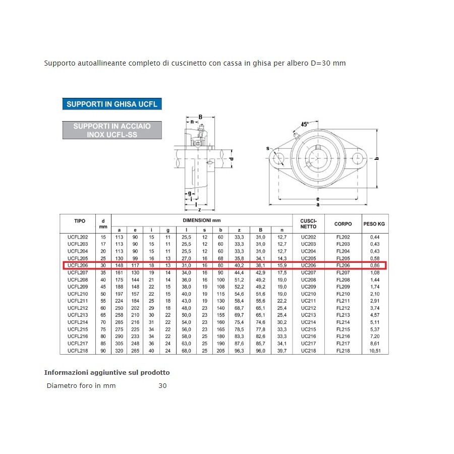 Supporto autoallineante completo di cuscinetto con cassa in ghisa per albero D=30 mm