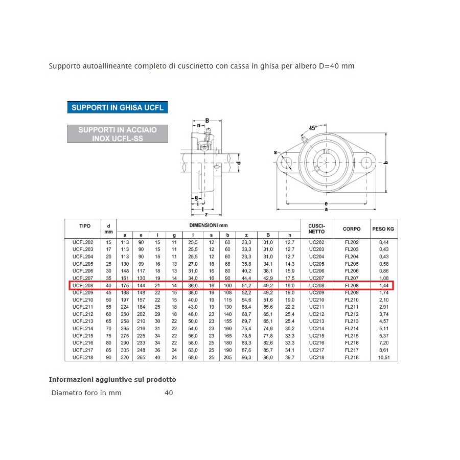 Supporto autoallineante completo di cuscinetto con cassa in ghisa per albero D=40 mm