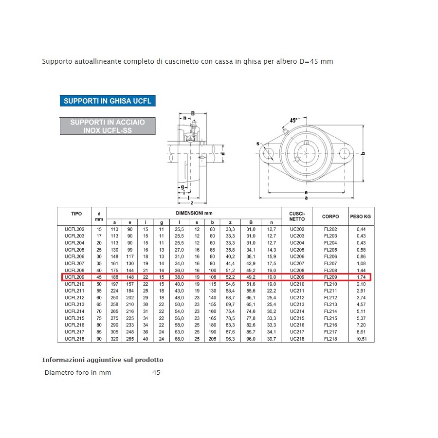 Supporto autoallineante completo di cuscinetto con cassa in ghisa per albero D=45 mm