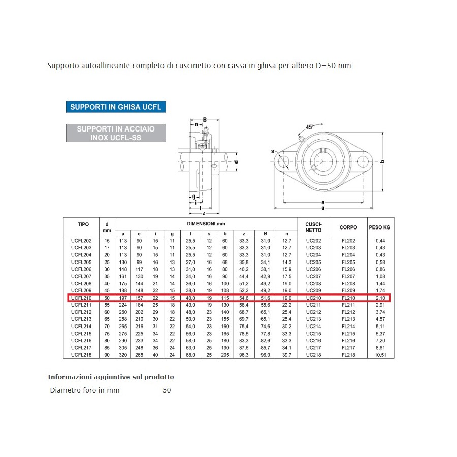 Supporto autoallineante completo di cuscinetto con cassa in ghisa per albero D=50 mm