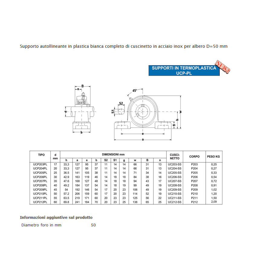 Supporto autollineante in plastica bianca completo di cuscinetto in acciaio inox per albero D=50 mm