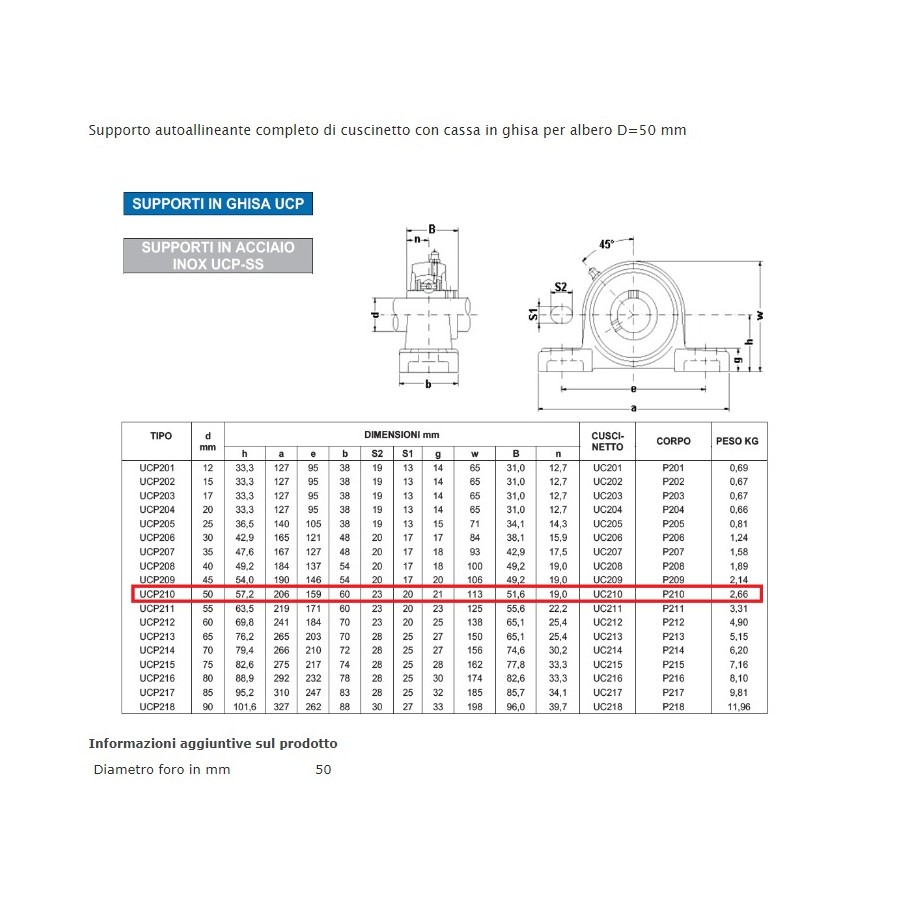 Supporto autoallineante completo di cuscinetto con cassa in ghisa per albero D=50 mm