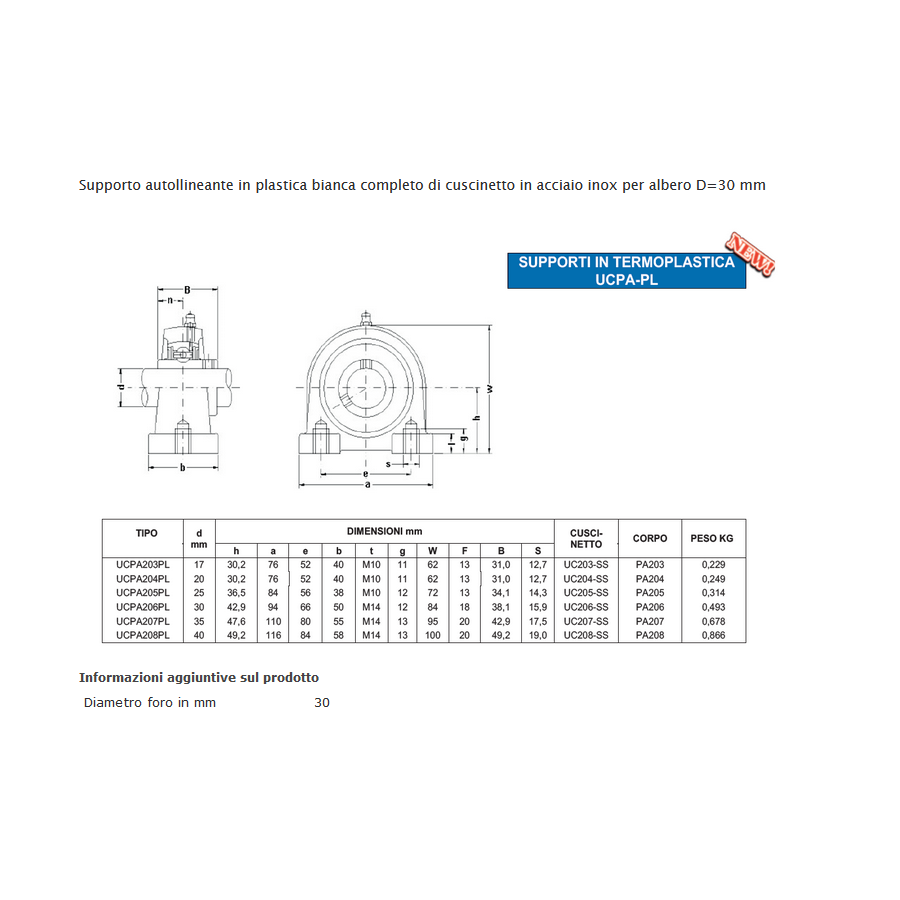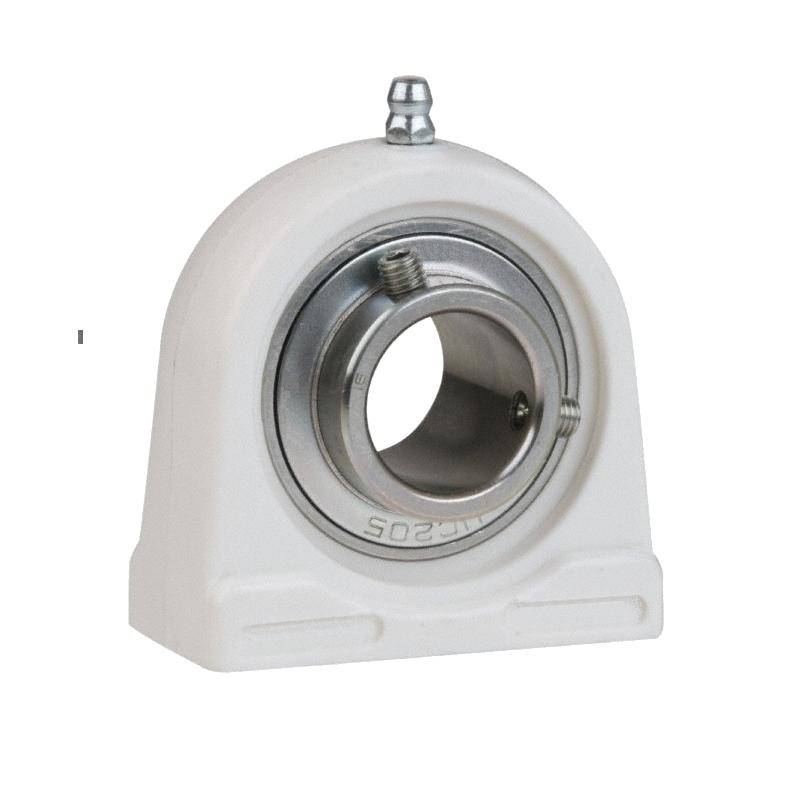Supporto autollineante in plastica bianca completo di cuscinetto in acciaio inox per albero D=30 mm