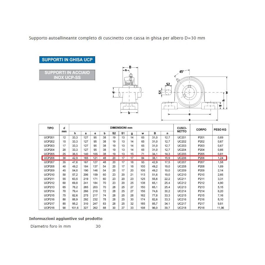 Supporto autoallineante completo di cuscinetto con cassa in ghisa per albero D=30 mm