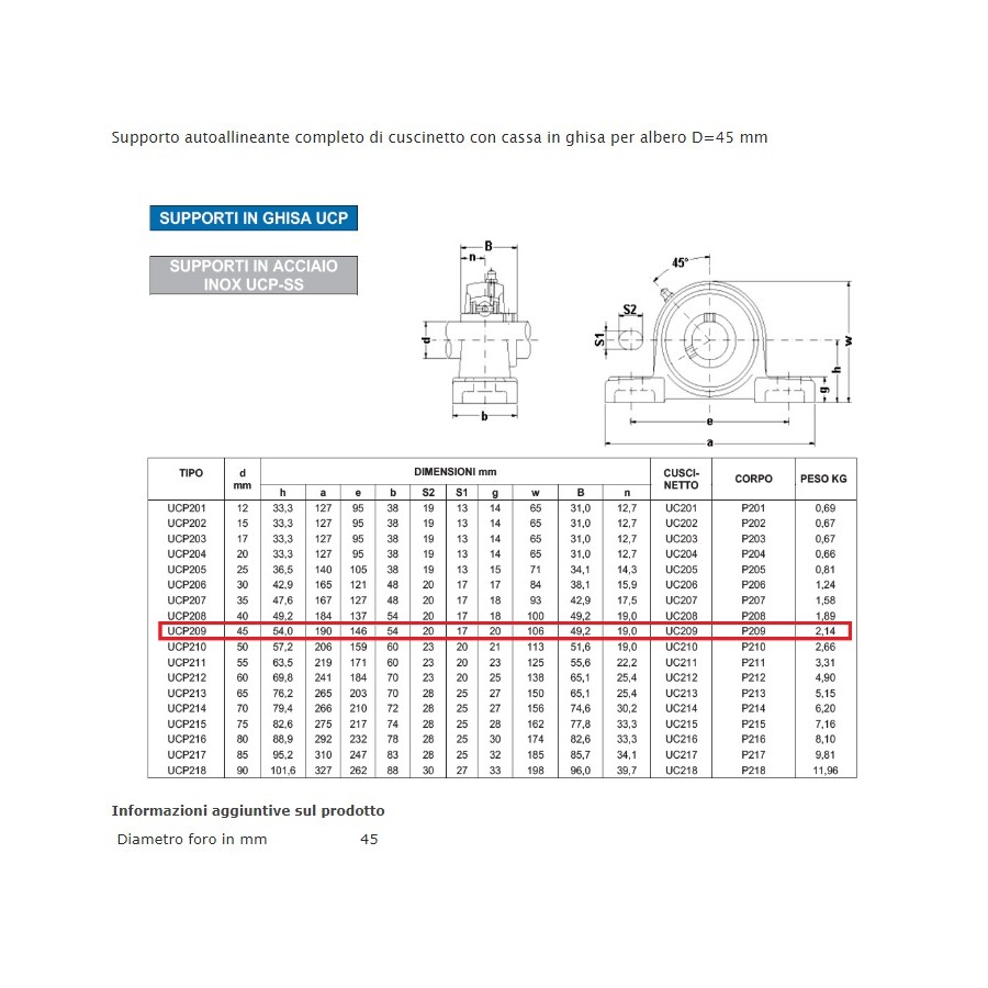 Supporto autoallineante completo di cuscinetto con cassa in ghisa per albero D=45 mm
