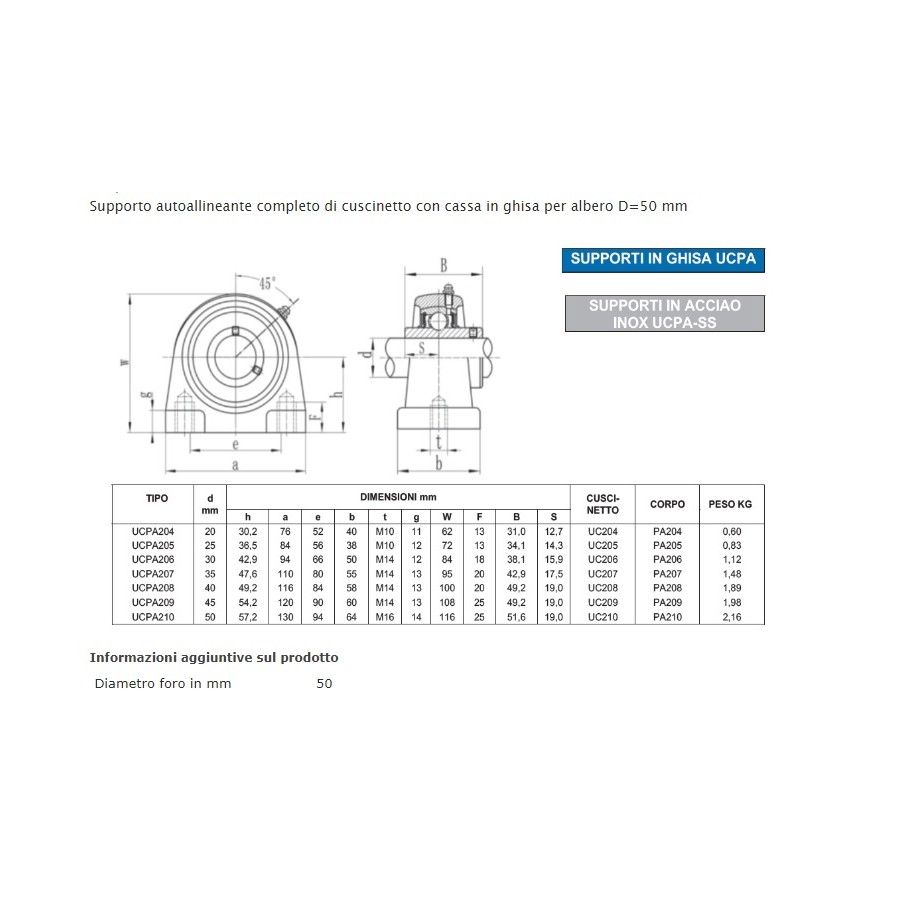 Supporto autoallineante completo di cuscinetto con cassa in ghisa per albero D=50 mm