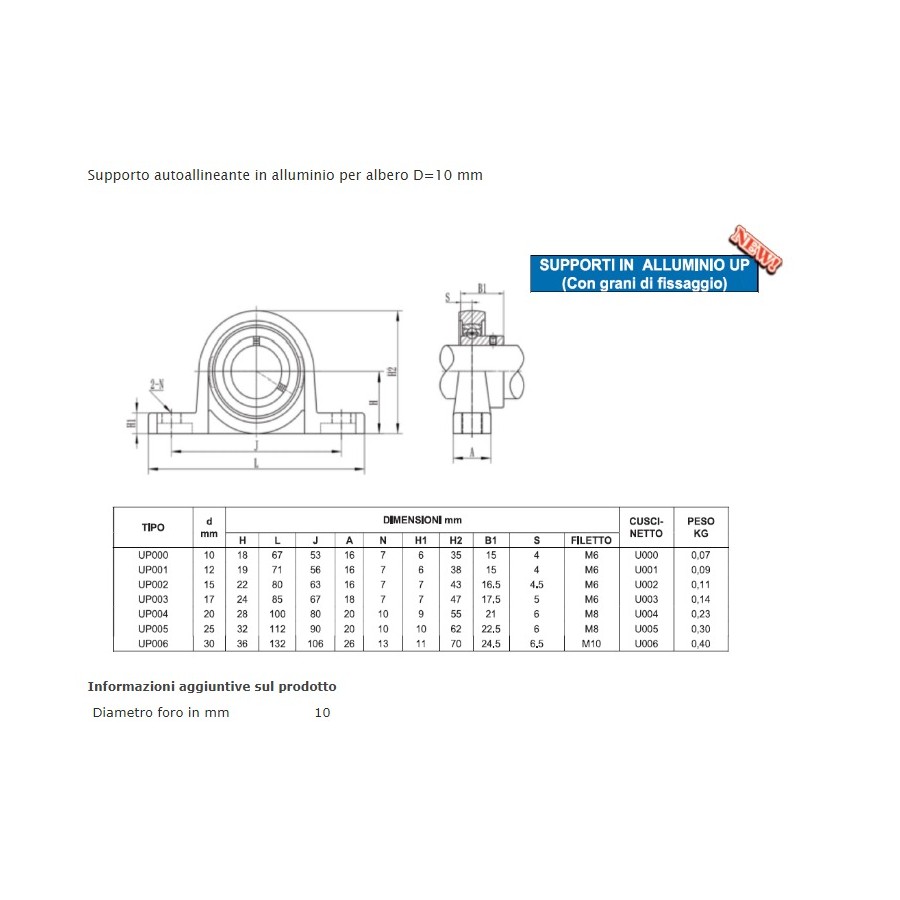 Supporto autoallineante in alluminio per albero D=10 mm